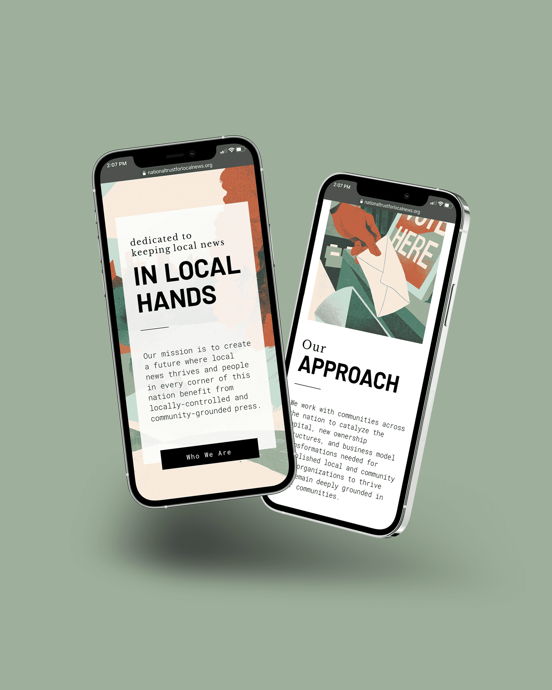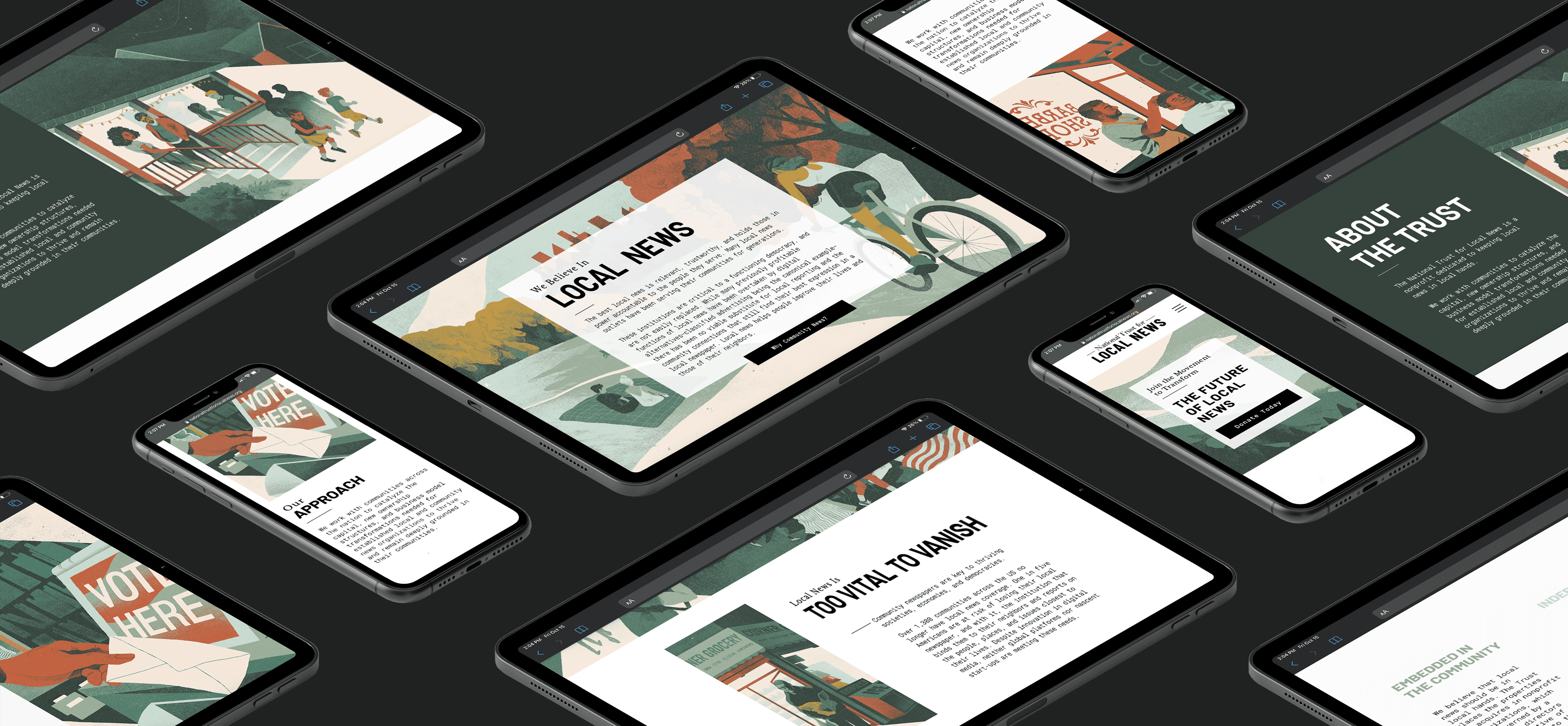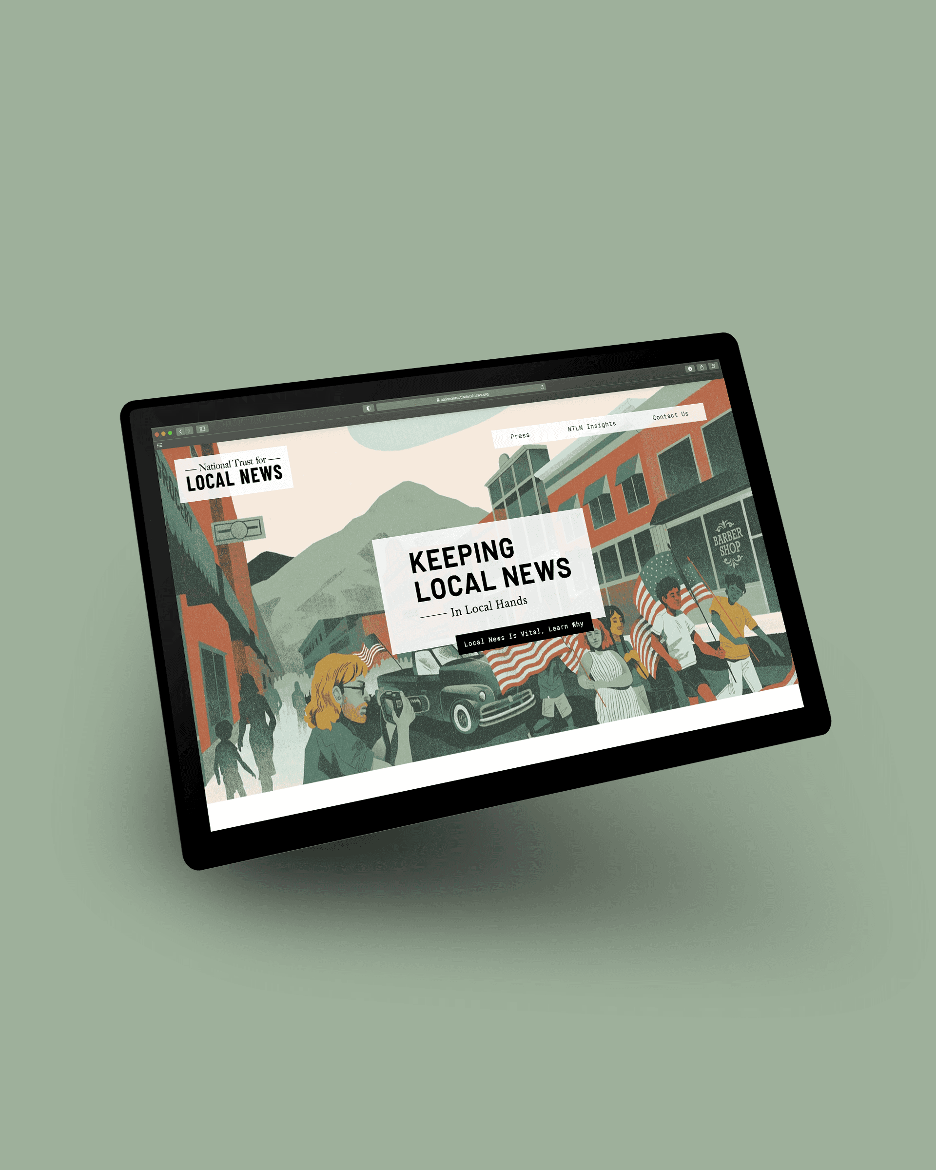 Our team built the Trust’s brand from the ground up, creating a recognizable brand that incorporates custom design elements and strategic messaging. The brand harnessed elements that spoke to the Trust’s roots in local communities and news, drawing upon imagery of small towns and urban areas, local events, and activities that might be mentioned in local papers. We were inspired by the Works Progress Administration (WPA) National Park posters to convey the Trust's value to grow and nurture local community news.