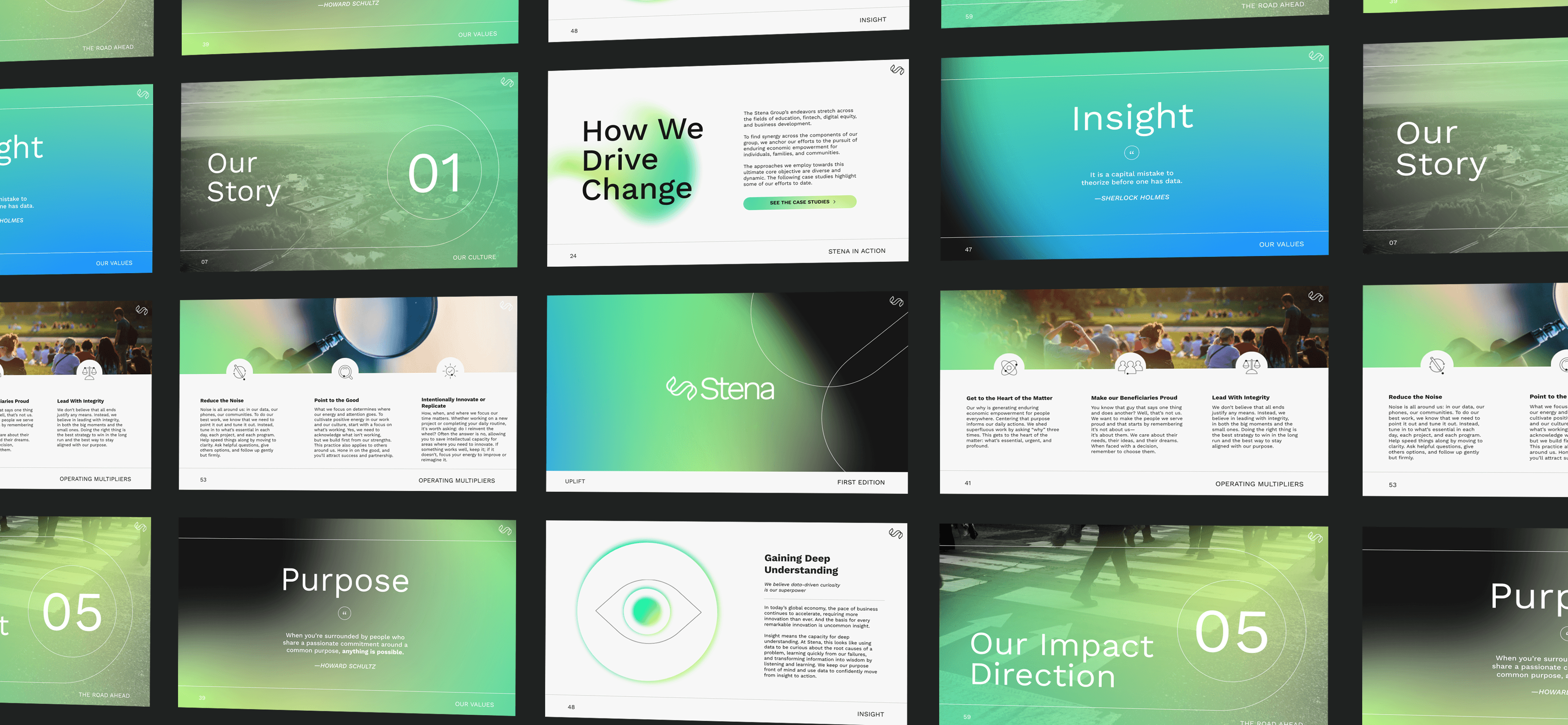 Stena Group is a mission-driven ecosystem of initiatives that leverages philanthropy, internal capital, and external capital for social impact. As a newly formed entity, the Group sought a professional partner to guide the teams through foundational strategic brand research and a comprehensive branding process whose outcome could communicate a complex organization with a definitive mission.