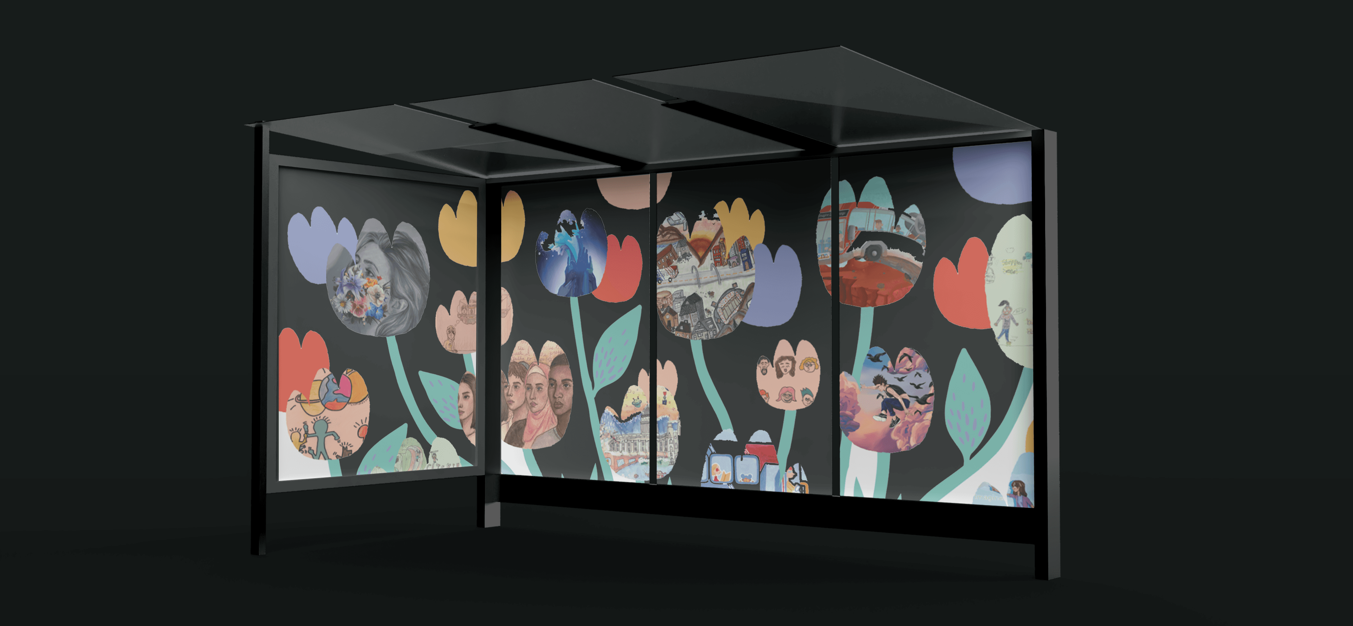 Each year, UTA’s Community Engagement program holds BeUTAHful— a biannual student art competition to celebrate the Utah Community and offer young artists a chance to showcase their work. For the last two years, our team has utilized winning designs from BeUTAHful to create shelter wraps. Our design solution for these shelters was to integrate as many student drawings as possible, while also creating a thematic set of wraps that unify the multitude of artistic styles from students.